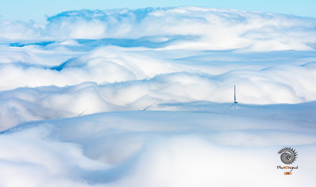 风力发电机屹立于山顶,在波涛汹涌的云海中时隐时现,不惧风雨。