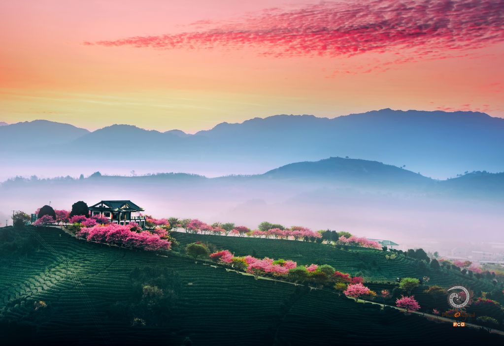 早春,晨曦映照茶园,一幅美丽的画卷。