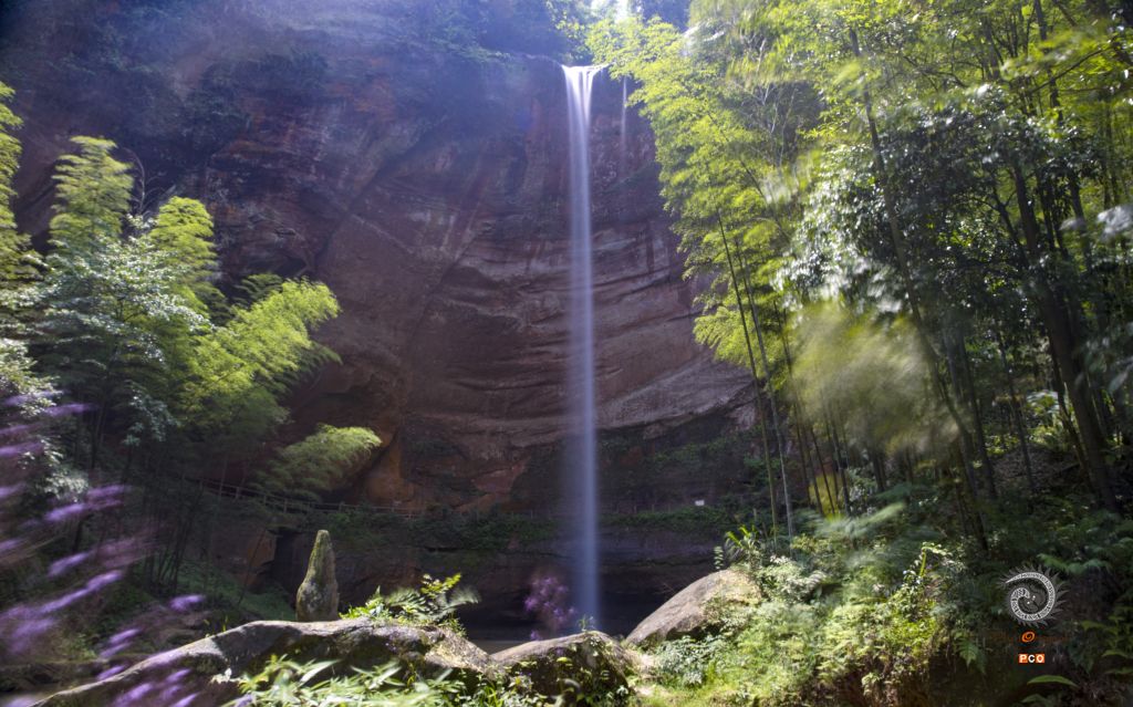 贵州赤水市长沙镇境内的锅圈岩瀑布,一块天然巨大的红色岩石,其间水花飞溅,形状如锅圈似的弧形岩圈,水雾弥漫,气势磅礴。