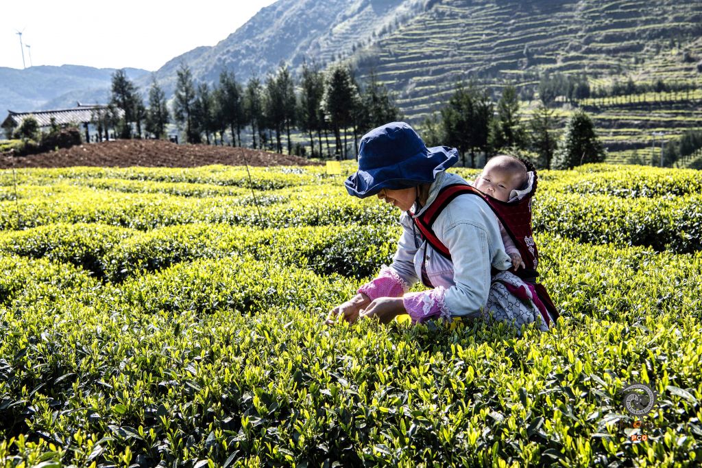 2019年3月22日,盘州市沁心茶场,一名妇女背着孩子采茶。