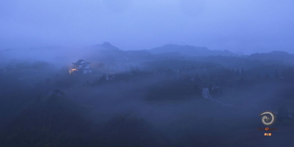 天蒙蒙亮,茶山的灯光依稀,漂浮的云雾好似给茶山盖上一张神秘的面纱,若有若无,如梦如幻。