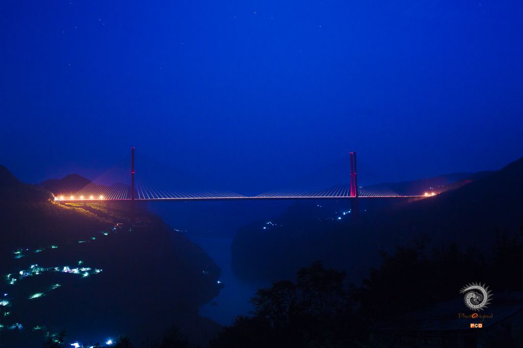 蓝色的天空下,鸭池河上一桥飞架,桥上霓灯飒飒,村寨路灯像上天洒下的繁星,把鸭池河妆扮得分外妖娆。