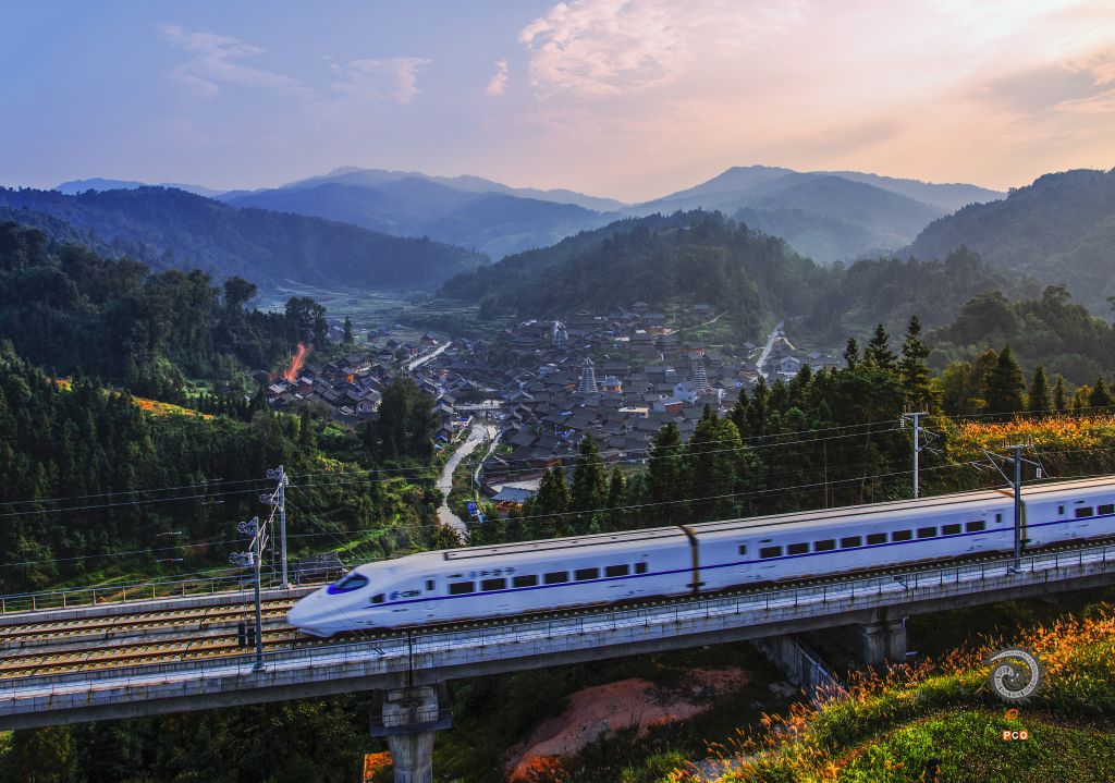 图为贵广高铁线上动车驶过从江县往洞乡朝利侗寨。2015.10.25摄于从江县朝利村。