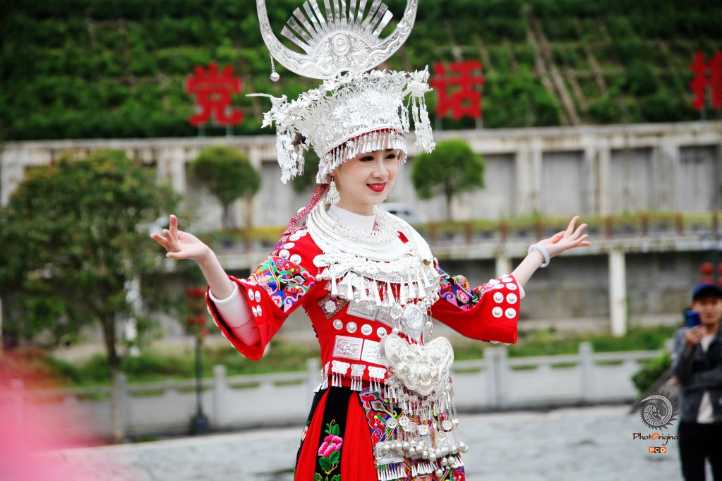 2021年4月25日拍摄于贵州省台江县姊妹广场,县城万人空巷,来自全县各地的苗族同胞以及省内外游客汇聚在一起,共同见证了“盛饰台江——苗族盛装游演”活动,图为身着苗族盛装的歌手吸引无数摄影师和游客拍照。