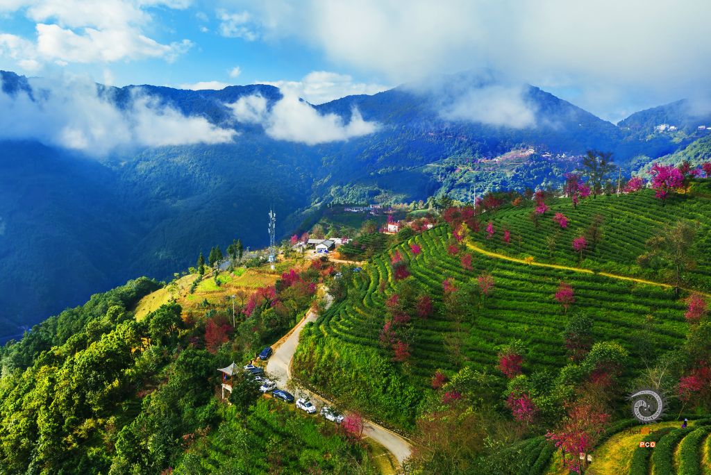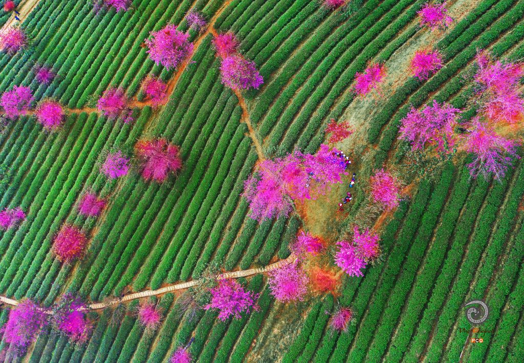 拍摄于无量山樱花谷茶园,2021年11月樱花盛开季节,一群美女在茶林樱花树下翩翩起舞。无人机空中俯拍。
