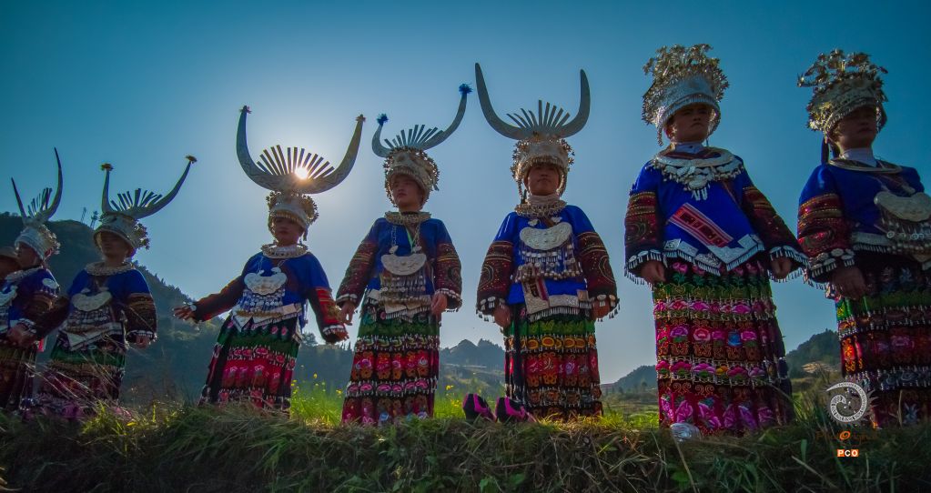 2019年3月29日拍于贵州省凯里市丹寨县高要村。当日丹寨县在高要村举行春耕大典彩排,几名苗族女子身着盛着,站在梯田上,形成一道靓丽的风景线。