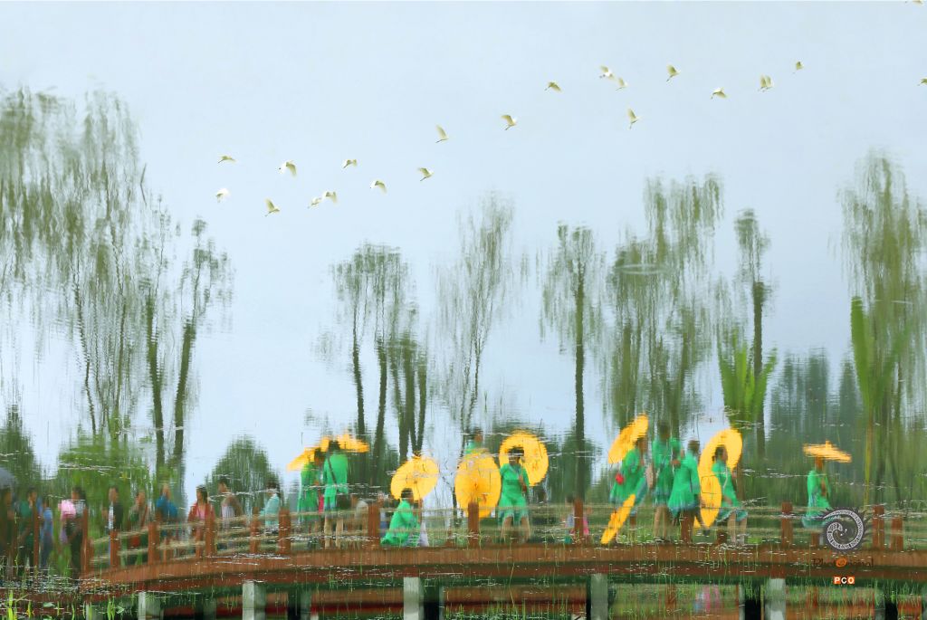 利用水面倒影,营造一幅梦幻般迷人的春游景象。