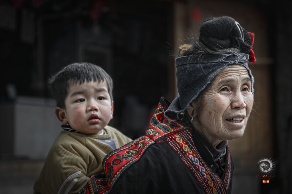 作品拍摄于贵州省黔东南苗族侗族自治州雷山县朗德上寨,由于目前朗德人民的生活依旧很贫困,年轻一辈多采用外出务工的方式来补贴家用,所以便有了镜头前这一幕。相隔两辈的老人与孩子,只是这仅有106户人家寨子的小小缩影。