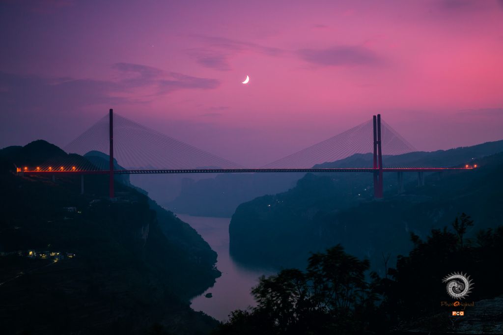 一轮弯月挂在鸭池河大桥正上空,绚丽的晚霞映照鸭池河,悠静的鸭池河美轮美奂。