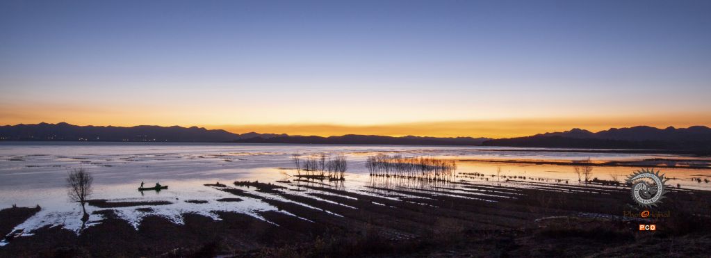2017-02-05摄于贵州威宁草海 晨光微露 初醒的草海红霞腾空 碧海溢彩 一叶小舟醉草海
