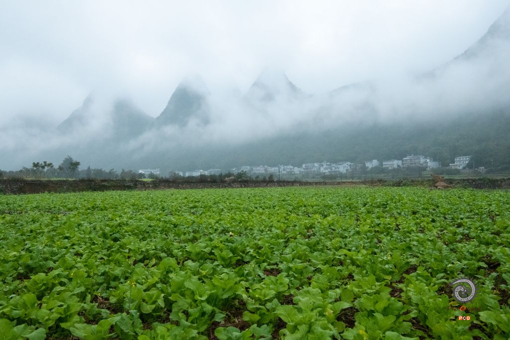 山峰耸立,薄雾缭绕。一排排的新居十分抢眼,田野里的蔬菜葱绿茁壮,生机勃勃。