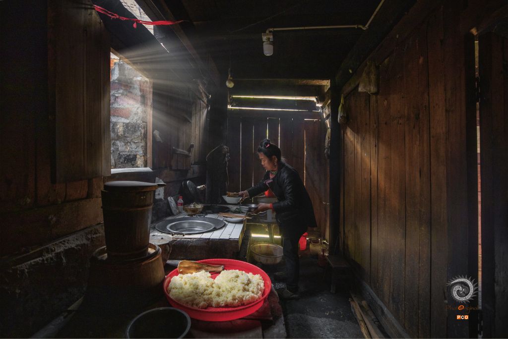 在贵州黄岗侗寨,一位侗族妇女正在忙碌午饭。