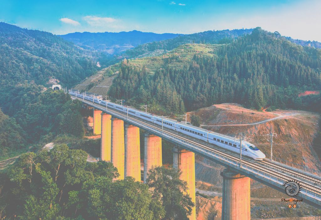 动车驶过贵广高铁贵州省黔东南从江县境往洞镇朝利村大桥。2015.10.25摄于从江县朝利村。
