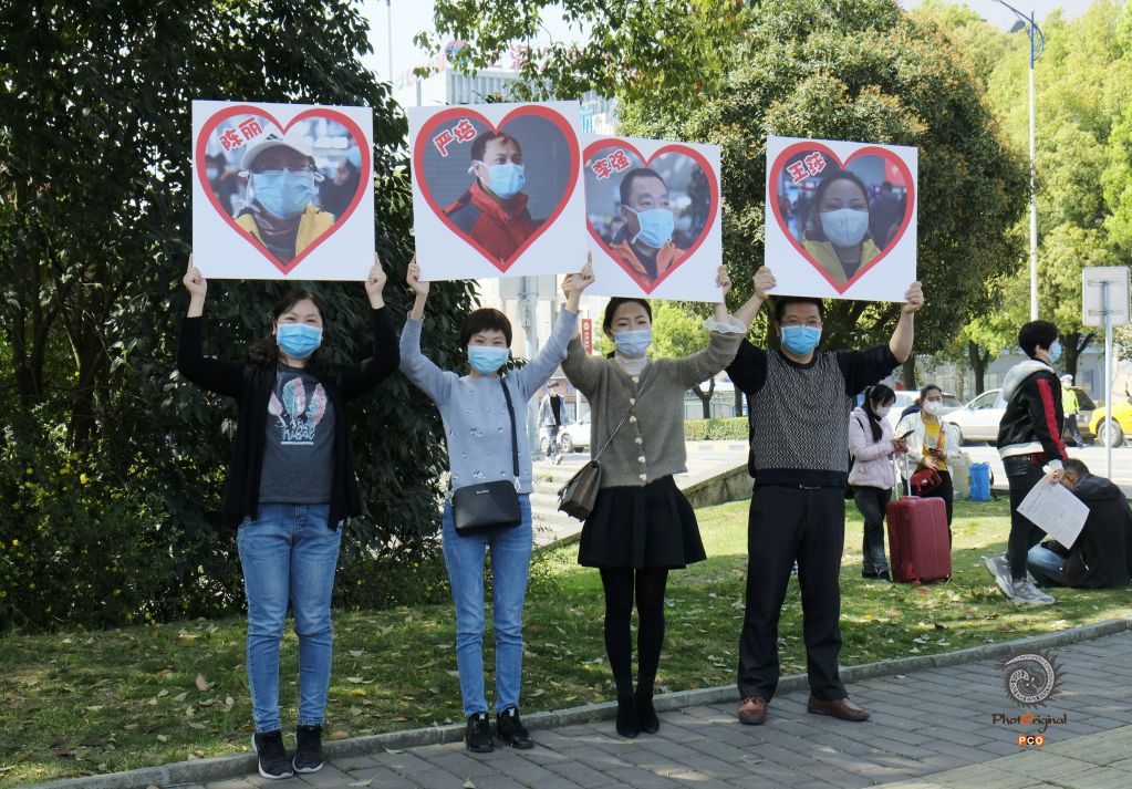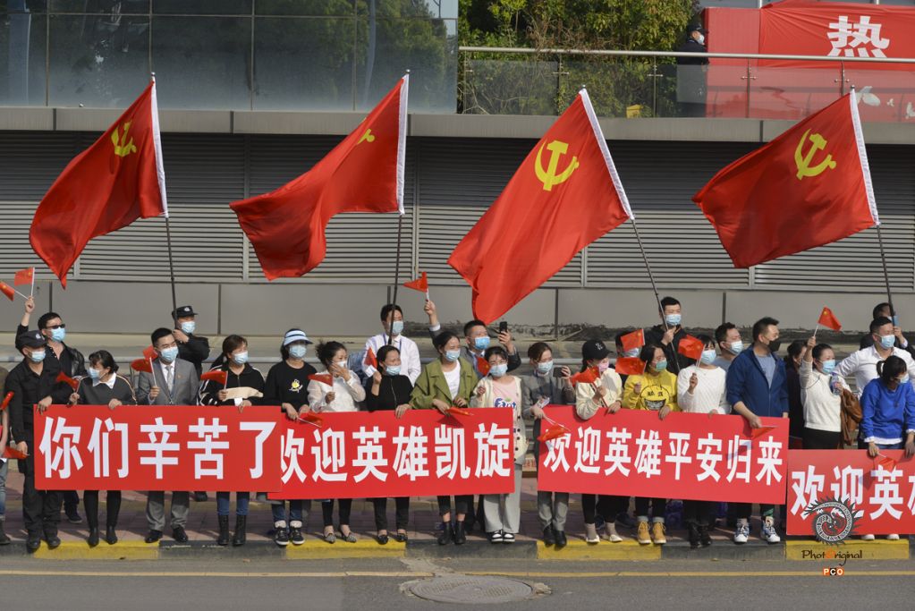 2020年3月20日拍摄贵阳机场。贵州省支援湖北鄂州市疫情防治的第一、四、九批援鄂医疗队首批433名队员圆满完成各项任务。在贵阳机场1号大道两边,早以等候欢迎各医院的队伍和市民群众手举“热烈欢迎贵州援鄂医疗队英雄凯旋”“你们辛苦了”等横幅,挥舞着国旗,齐声欢呼“英雄凯旋、欢迎回家”。