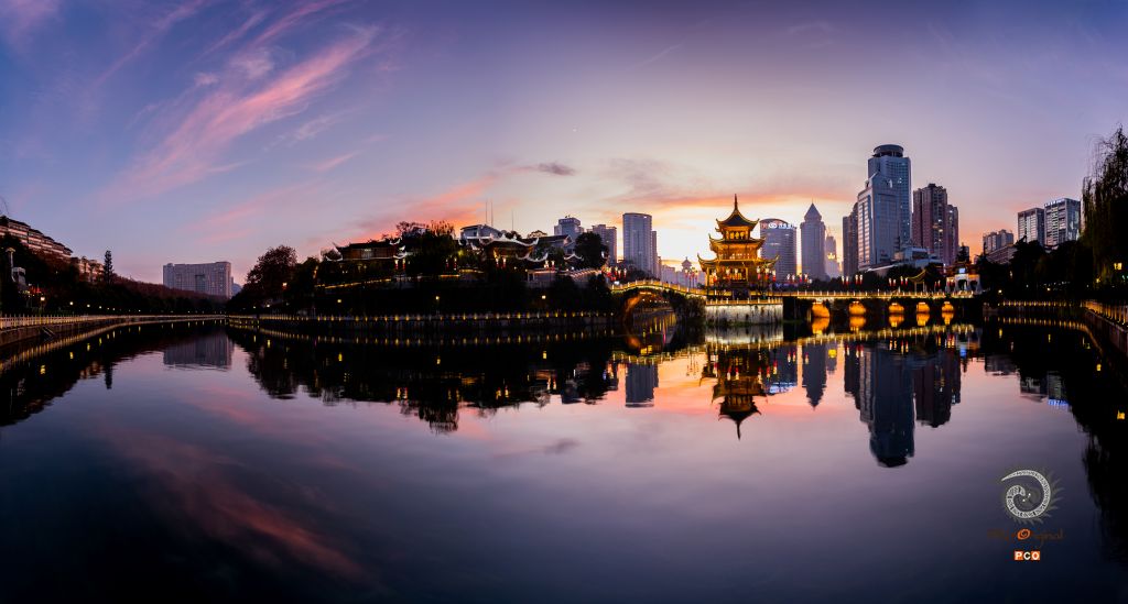 夕阳下,一点红云,甲秀楼的灯光以及水面的倒影在夕阳的映衬下格外的美丽