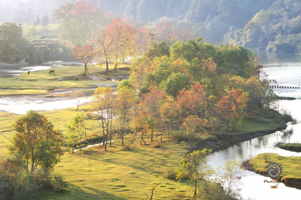 《亮江秋色》拍摄于2018年11月2日,地点:锦屏县雷屯村。亮江因地平水缓,江中沉积大小不一的沙洲,每到秋天,沙洲上的草木有的变黄,有的变红,有的变紫,犹如泼彩。