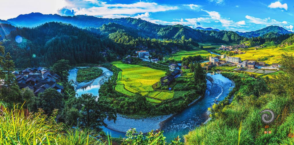 乌洛河位于贵州省榕江县三江乡境内。图中所摄流经村寨分别为(由远及近):乔来侗寨、列戈苗寨、乔乌苗寨。2018年9月摄于乌洛河畔。