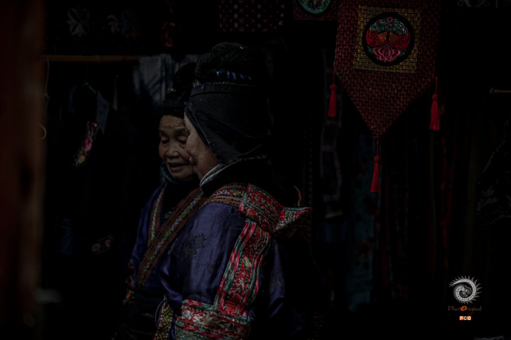 作品拍摄于贵州省黔东南苗族侗族自治州雷山县朗德上寨,寨子里的老人们常常会聚在一起唠唠家常,图中记录了寨里欢迎仪式之前,这对双双年近八旬老闺蜜聚在自家苗绣店铺前闲聊的一幕。