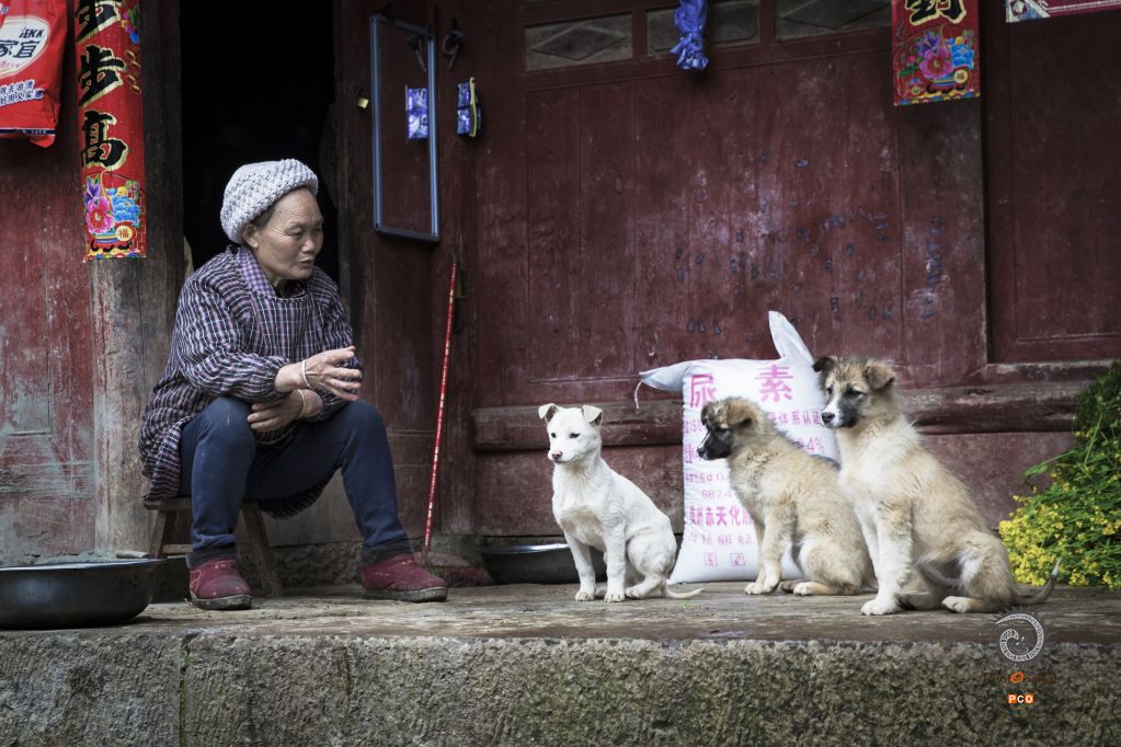 在石阡县五德摄影扫寨时,遇到一位老奶奶正在对三只小狗讲话,然而,三只小狗听得非常认真,场面十分有趣。