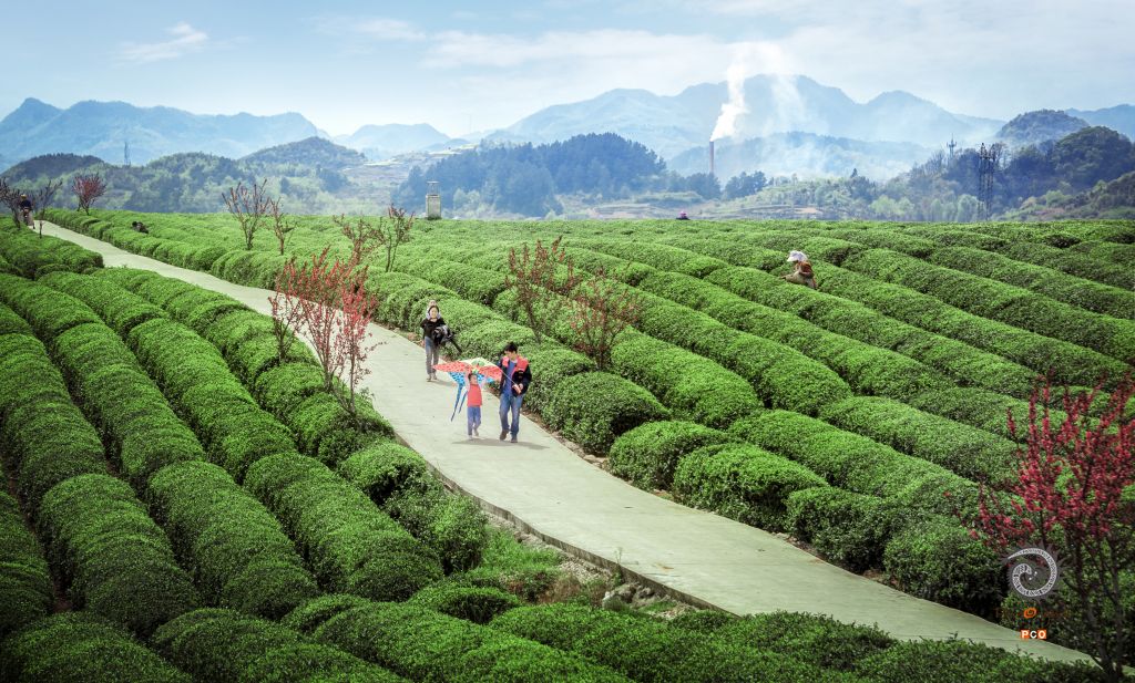 摄于2021年3月28,一家四口拿着风筝,春风满面地走在茶场的小路上,茶道中采茶工人忙于明前茶的摘采,使画面呈现出一幅春意盎然的景象。