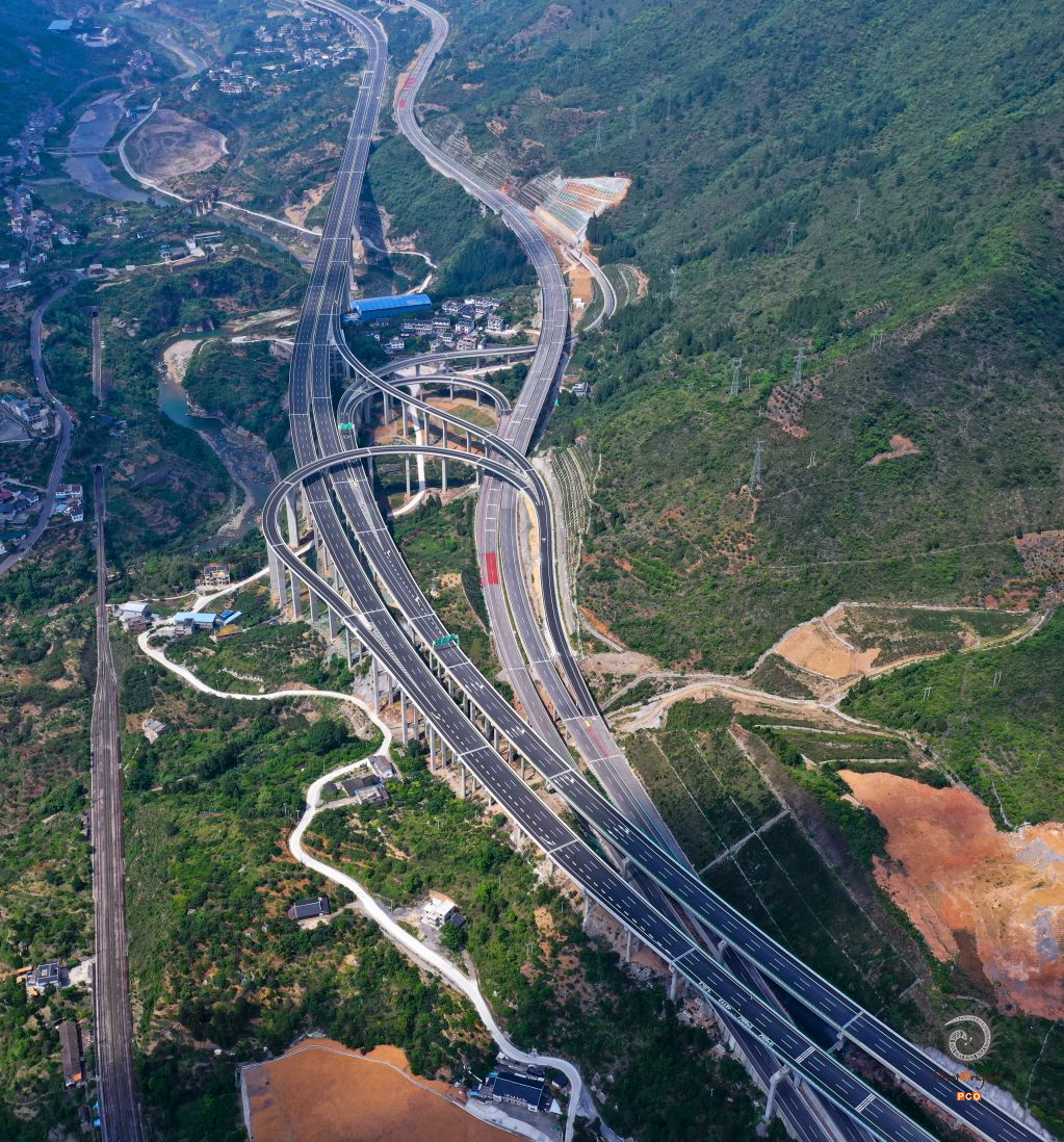 2023年5月28日,鸟瞰贵州遵义市桐梓县三元镇漂亮的渝筑高速(渝黔复线高速)与印习高速立交互通大桥。