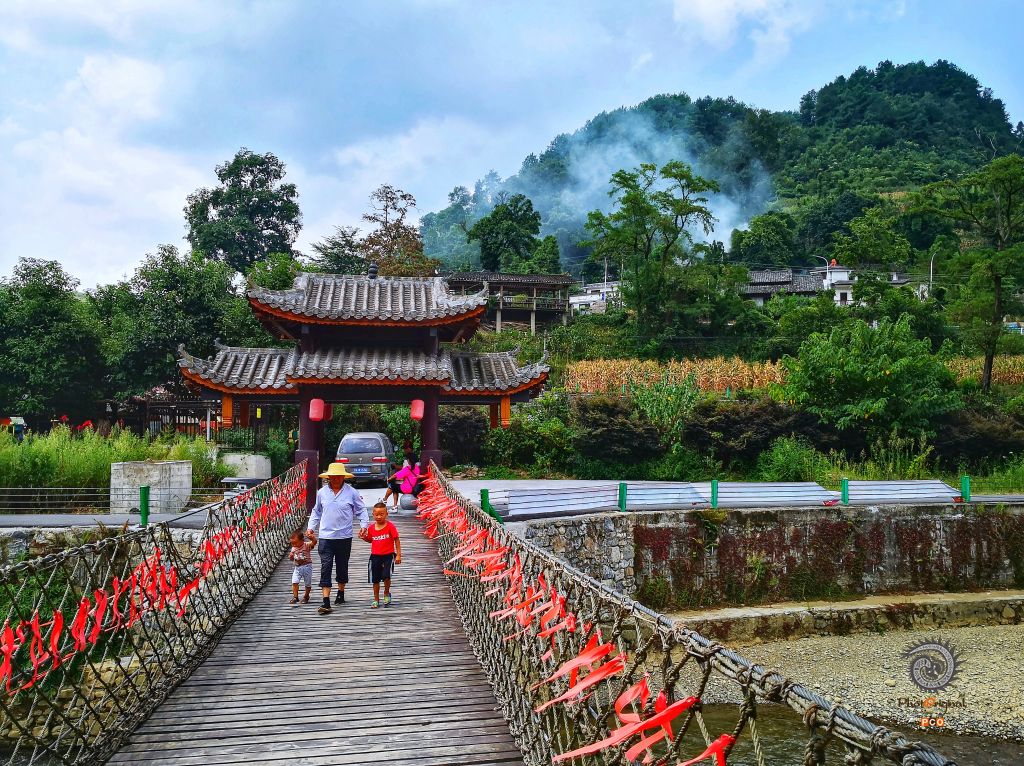 2019年8月,拍摄于贵州省开阳县禾丰乡水头寨。布依族村民正走在轻便、富有地方特色的跨河吊桥上。