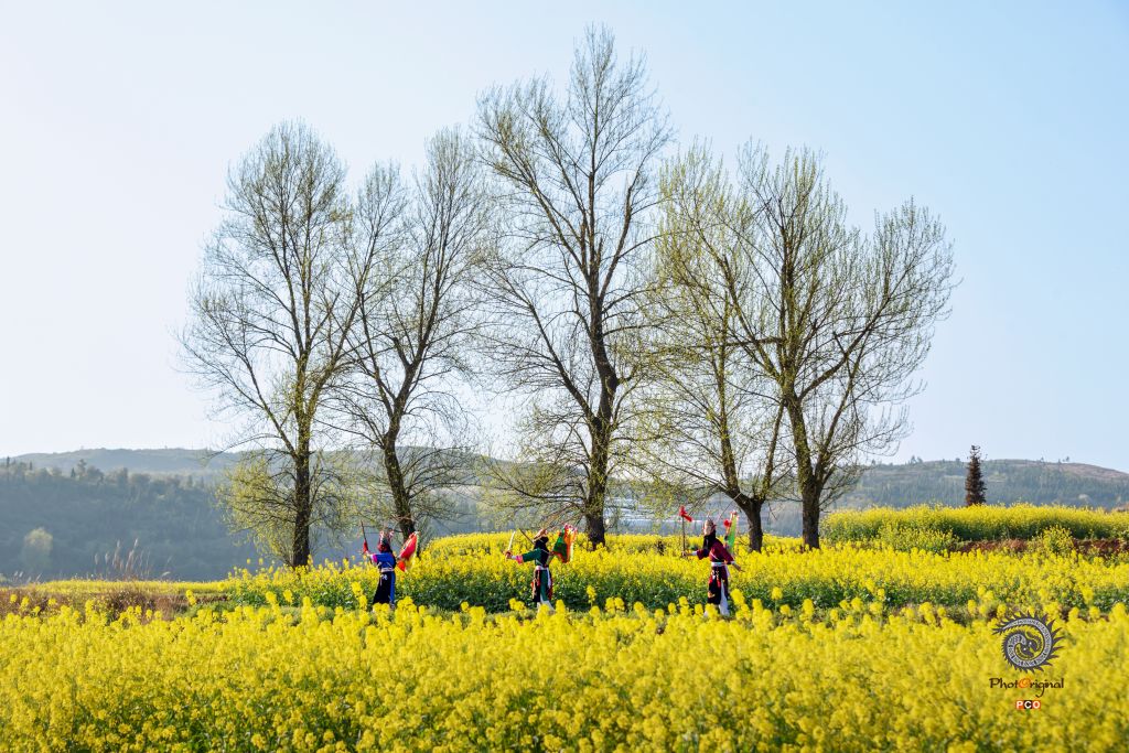地戏表演者穿行于油菜花田间。