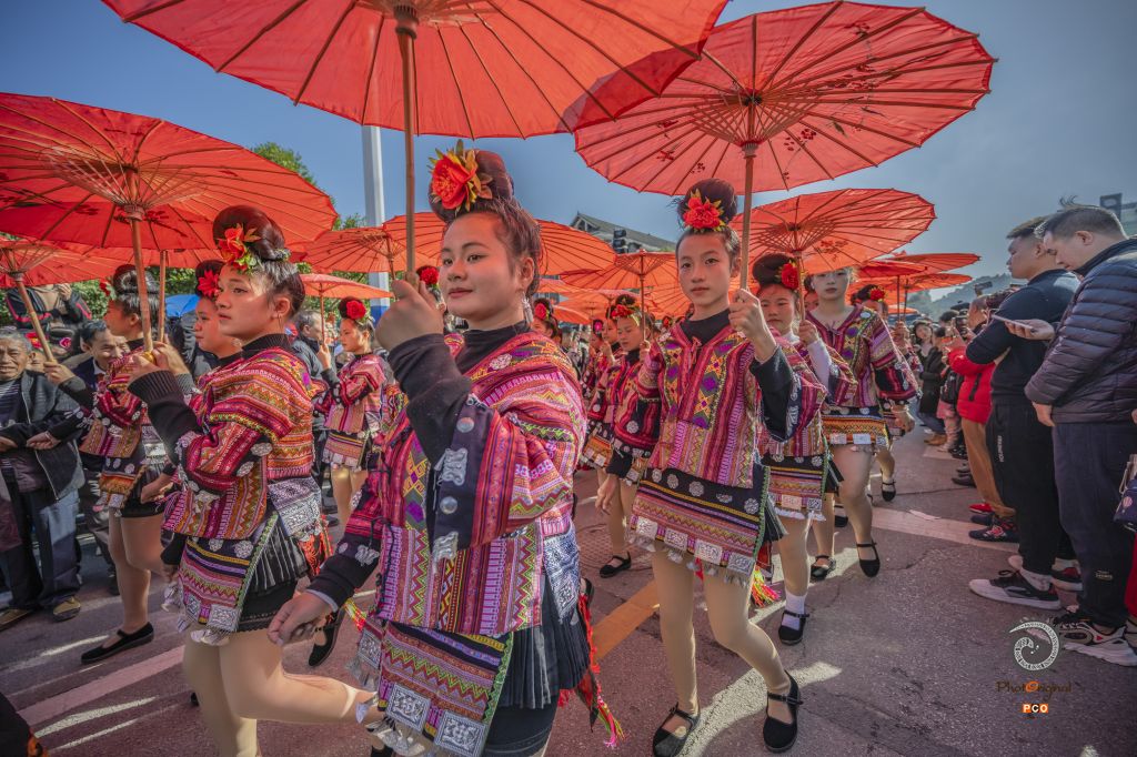 2023年11月16日,贵州省苗族侗族自治州雷山县城,苗族姑娘穿盛装游行。