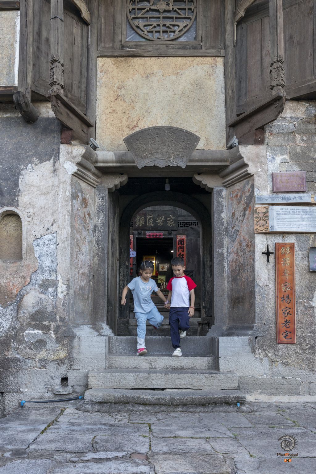 2025年7月20日摄于安顺本寨村,二个孩童携手从百年古宅里跨越门槛走出来,童趣给古宅带来了新生。