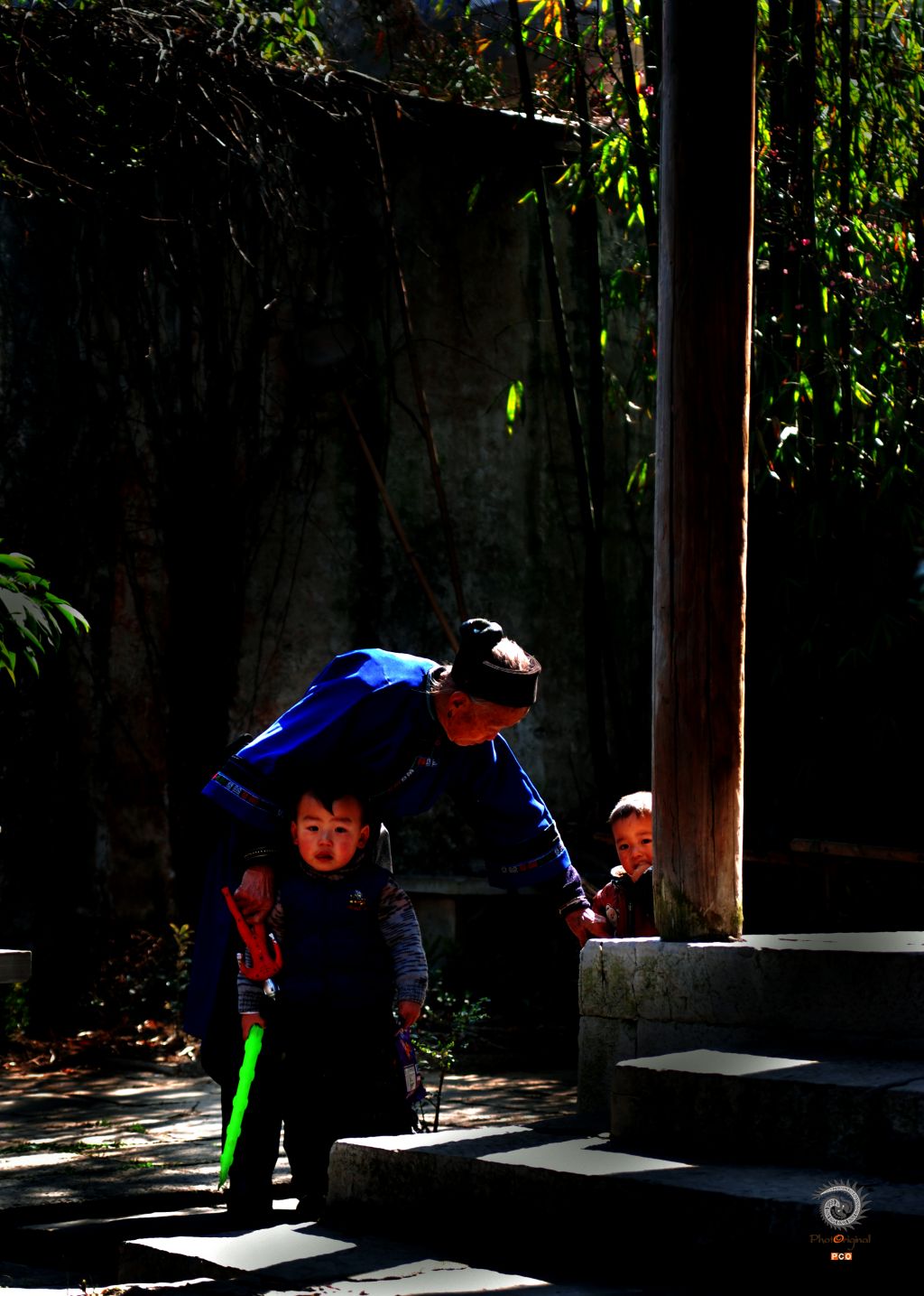 拍摄地点为天龙屯堡,光影处正好有一位带孩子的老妇人