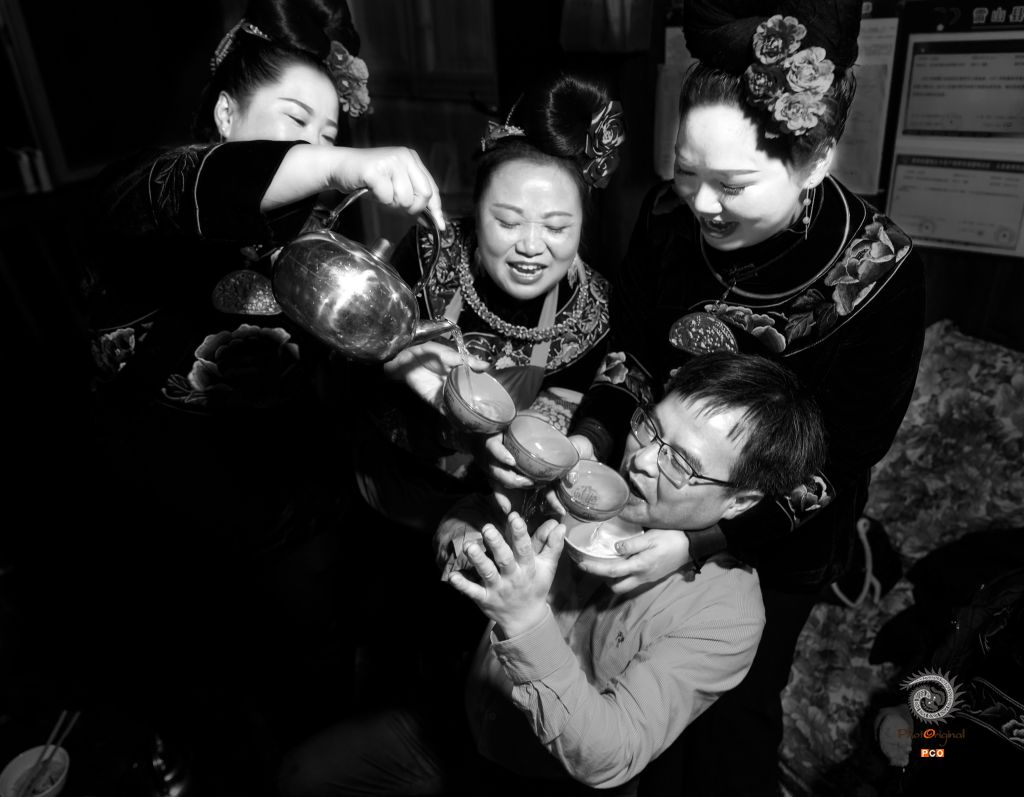 贵州雷山县苗族人家待客非常热情,用高山流水方式来敬酒招待客人