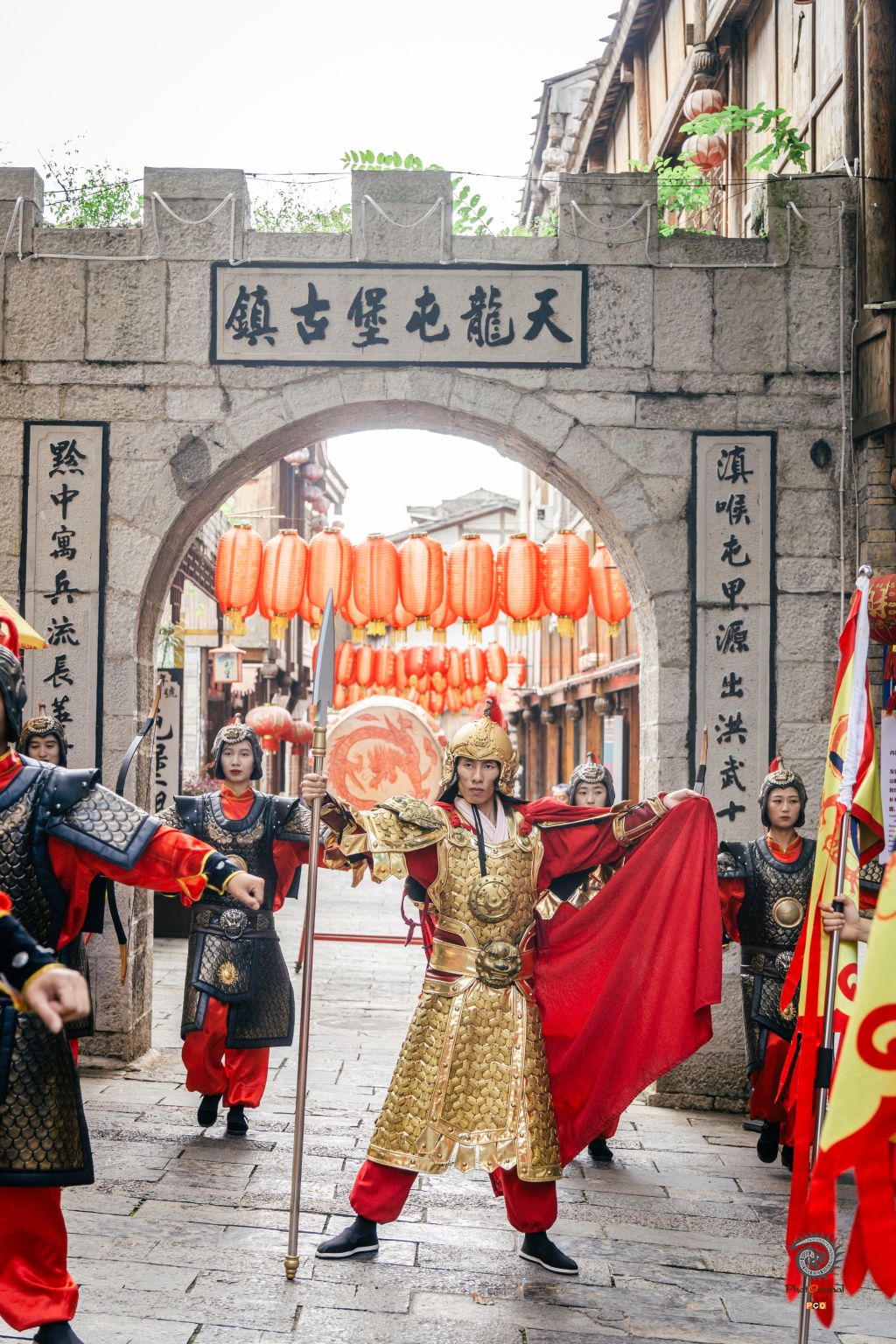 贵州安顺平坝区的天龙屯堡,是明代“调北征南”屯军后裔聚居地,被誉为“明代生活的活化石”。其历史可追溯至洪武十四年(1381年),朱元璋派军平定西南后,江浙汉族士兵在此屯田戍边,形成独特的军事移民文化。 图一:中式木构大门飞檐翘角,黑底金匾“天龙屯堡”端立,灯笼垂联、门楣面具,串起600年“调北征南”屯军记忆。 图二至四:金甲、黑红甲武士执枪列阵于“天龙屯堡古镇”石拱门前;红灯笼垂街,复现明代军傩遗风,活态演绎“寓兵于农”的屯堡精神。