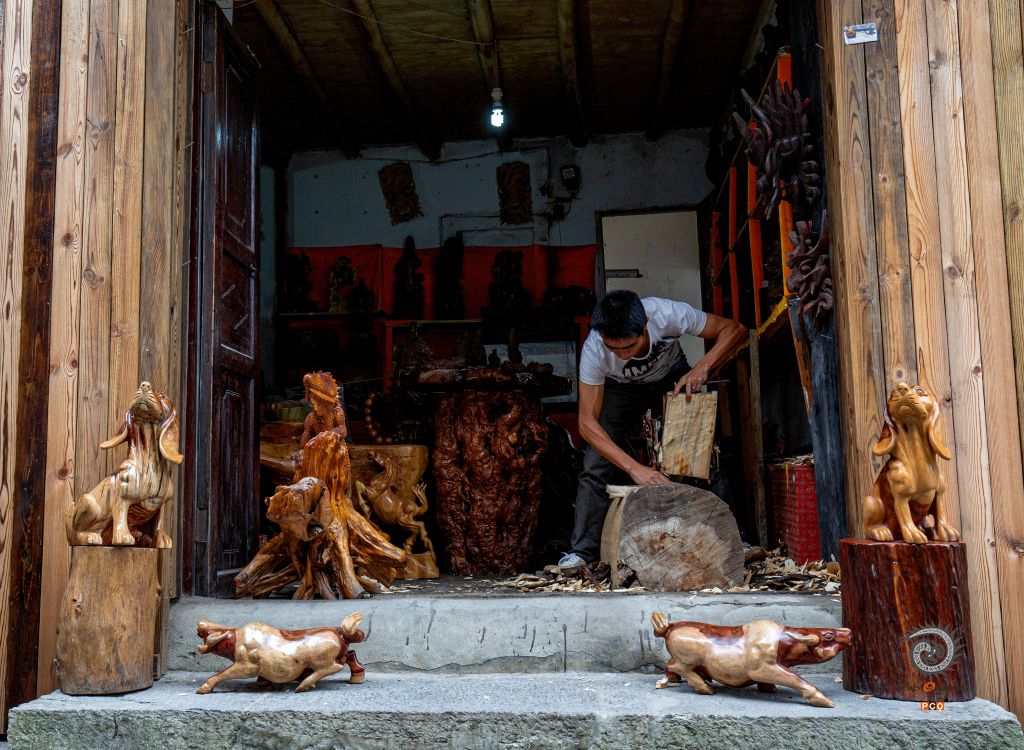 一位屯堡小伙子在进行木雕创作。2015年9月18日摄。