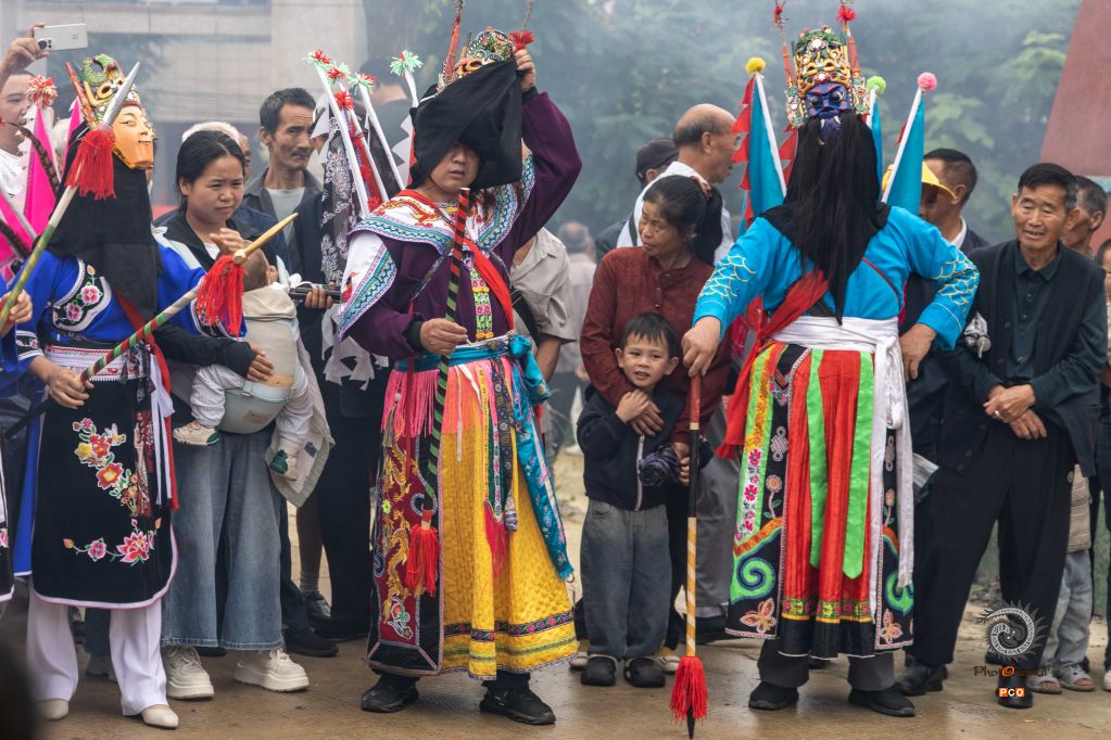 2025年6月30日,贵州省安顺市大西桥镇举行传统的“抬关公”活动,地戏表演者休息时撩开面纱,引起旁边妇女好奇的目光。