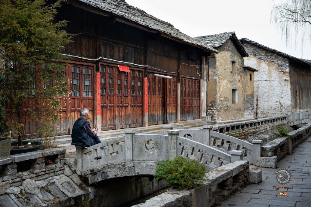 一位抽着旱烟袋的老人坐在征定河的石桥墩上,望向小河与巷子的尽头。