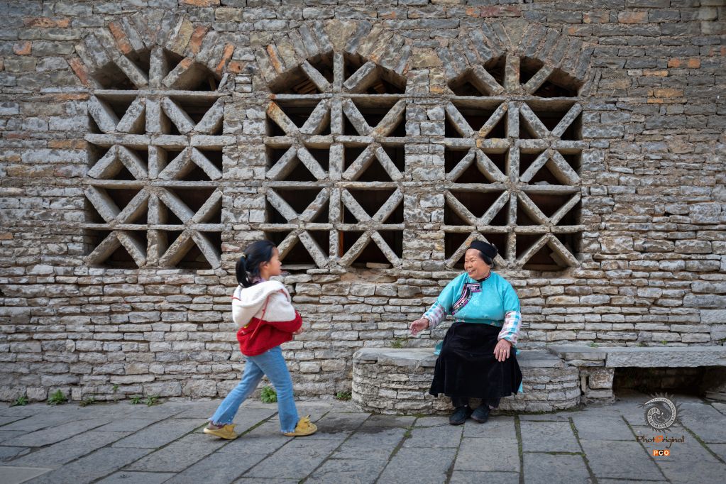 石房、石墙、石窗、石凳,屯堡就是由石头构成的世界,孙女向坐在石凳的奶奶跑去。