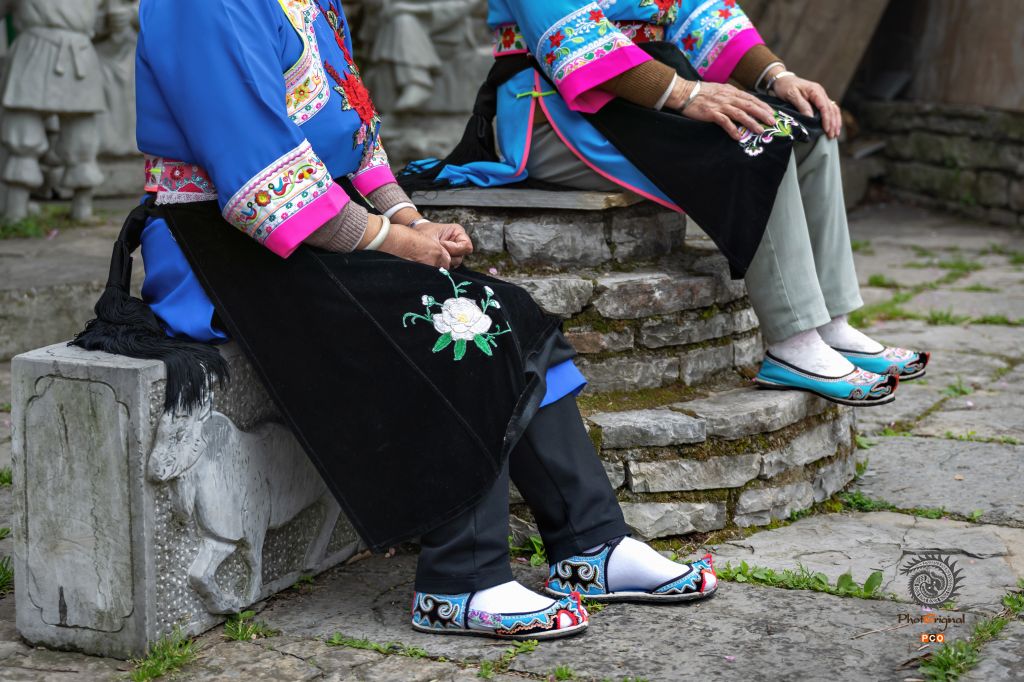 屯堡妇女脚上穿的鞋,其显著特征除了精美的刺绣图案之外,鞋尖是翘起的,俗称“翘翘”。