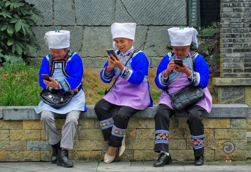 贵州贵阳青岩古镇,身着传统民族服饰的当地游客,正沉浸在手机的世界里。