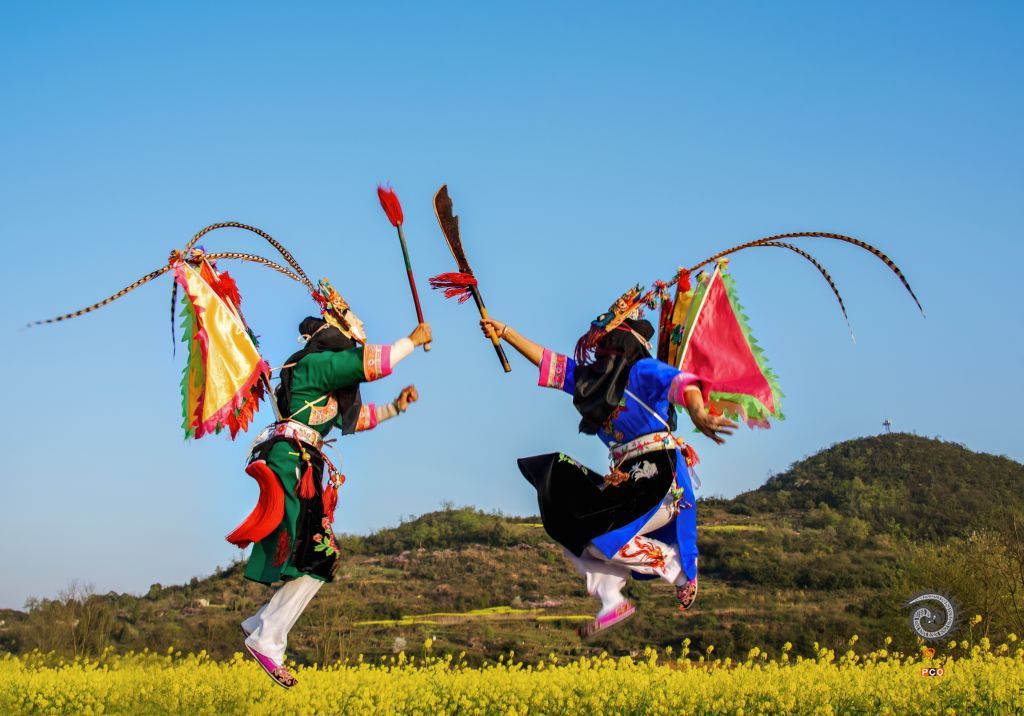 春天的油菜花田旁,两位地戏表演者在表演地戏。
