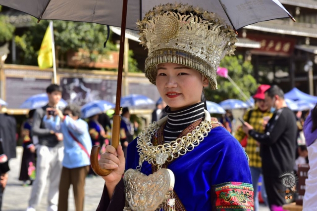 拍摄于2021年3月千户苗寨。来到寨门前,首先映入眼帘的就是这极为壮观的“高山流水” 这是苗族人热情好客的最佳表现,美丽的苗族姑娘们身穿盛装,在阵阵芦笙声中唱着动听的山歌,举起手中的酒海,从高到低缓缓的将米酒倒入远道而来的贵客的酒碗中“来到苗乡先品酒你喜欢也要喝不喜欢也要喝,管你喜欢不喜欢都要喝,你喜欢喝一杯,不喜欢喝三杯。”民族风情浓郁,让人驻足流连。