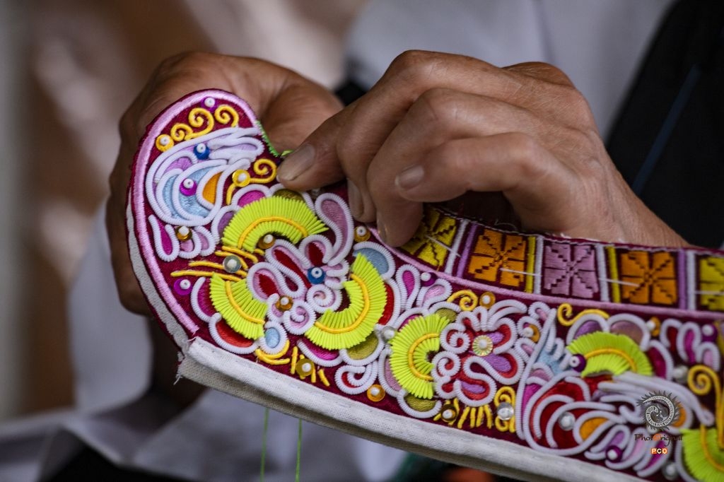 侗绣勾鞋——2022年7月28日,贵州省黔东南苗族侗族自治州榕江县乐里镇乔勒村,侗族老人手工制作绣花鞋2022年7月28日,贵州省黔东南苗族侗族自治州榕江县乐里镇乔勒村青年学生学习侗绣非遗手工(3/6)