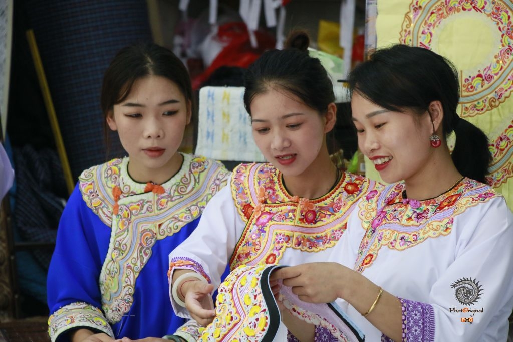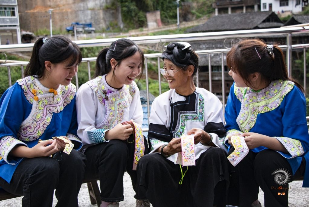 图6:2022年7月29日,在贵州省黔东南苗族侗族自治州榕江县乐里镇三联社区的一家民族服饰加工坊内,绣娘们精湛的手工技艺2022年7月28日,贵州省黔东南苗族侗族自治州榕江县乐里镇乔勒村青年学生学习侗绣非遗手工(6/6)