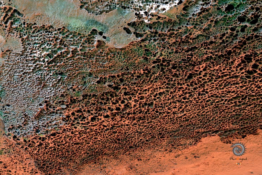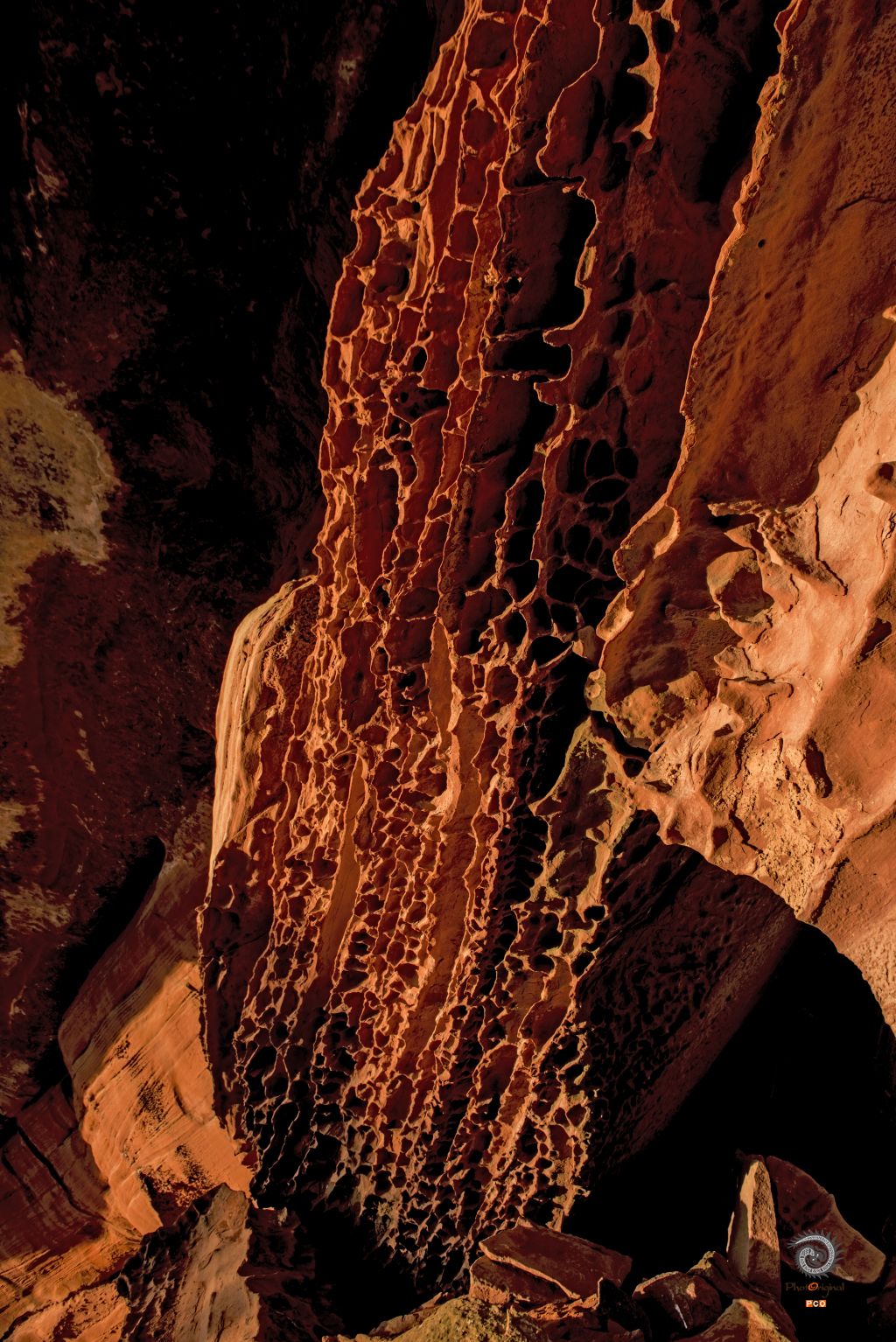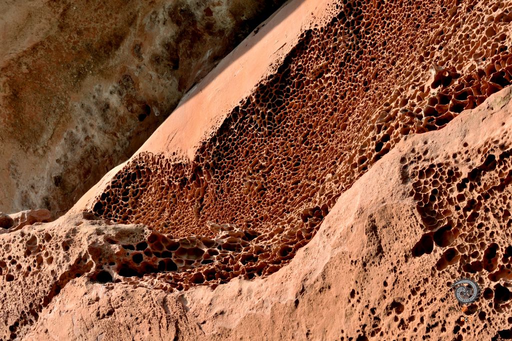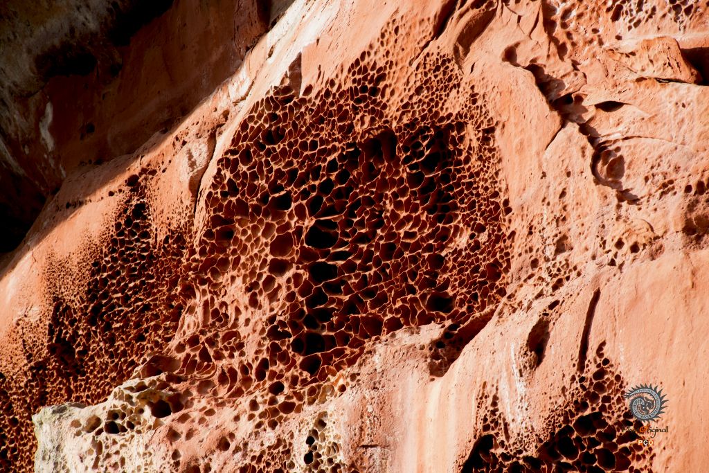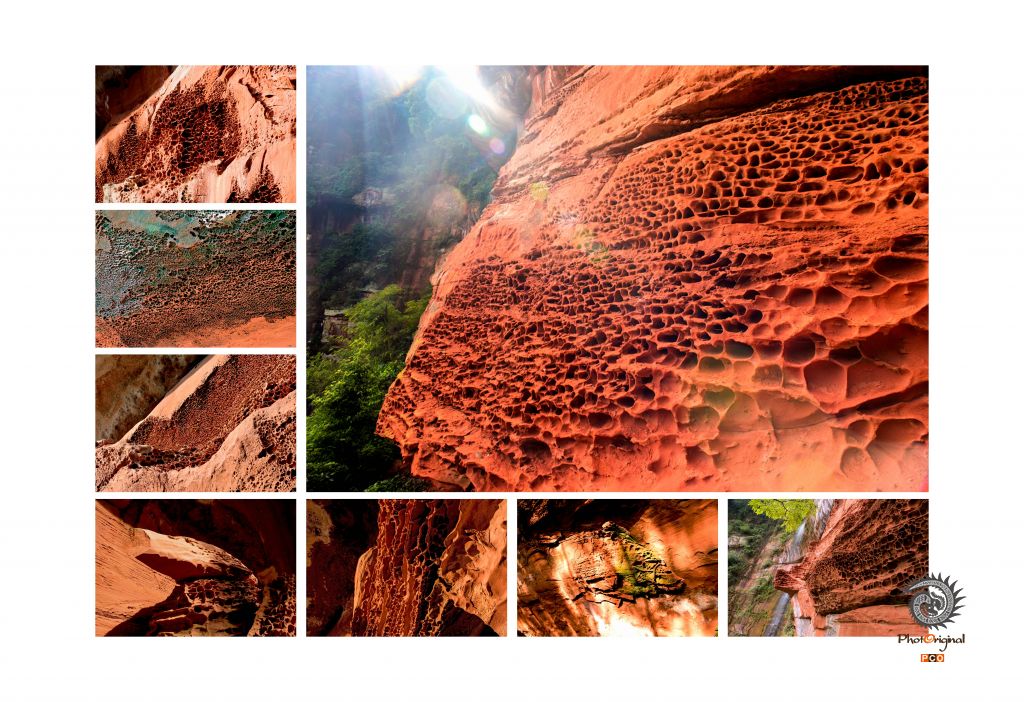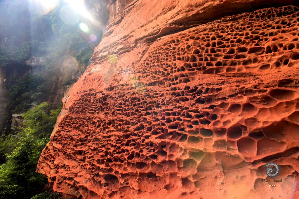 丹霞地貌是20世纪20年代由我国地质学家定名和率先研究的一种"红层地貌",即发育于侏罗纪至第三纪的水平或缓倾斜的厚层红色砂砾岩之上,由水流侵蚀及风化剥落和崩塌后退,形成顶平、身陡,麓缓的方山、石墙、石峰、石柱等奇险的丹崖赤壁地貌称为丹霞地貌。丹霞地貌岩石成分含有大量不易流失的三氧化二铁和三氧化二锰,经过阳光、风雨、气温、生物、地壳运动等多种自然力量的综合作用,形成了独特的地貌景观,蜂窝状是其中之一。
