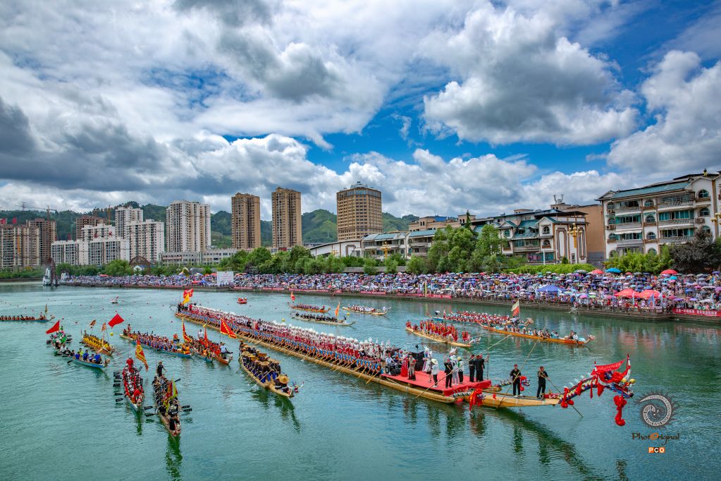 《长木龙舟闹端午》作品拍摄于贵州省施秉县。图为2021年6月13日,施秉县举行世界最长木龙舟展演,由200名苗家姑娘手持划桨,载着120名各民族盛装人员在98.8米的木龙舟上游江,引领着30多只龙舟队及独木龙舟沿着舞阳河巡游,场面十分浩大、壮观。