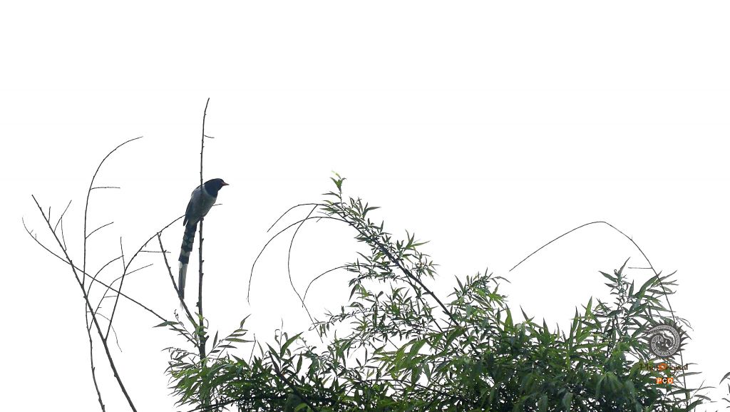 红嘴蓝鹊是一种体态美丽的鸟,头顶至后颈有一块白色至淡蓝白色或紫灰色块斑,其余上体紫蓝灰色或淡蓝灰褐色,尾长呈凸状具黑色亚端斑和白色端斑。主要栖息于山区常绿阔叶林、针叶林、针阔叶混交林和次生林等各种不同类型的森林中,也见于竹林、林缘疏林和村旁、地边树上。它被列入中国《国家保护的有益的或者有重要经济、科学研究价值的陆生野生动物名录》和《世界自然保护联盟》(IUCN)2016年濒危物种红色名录。 2021.04.22.摄于遵义绥阳双河谷