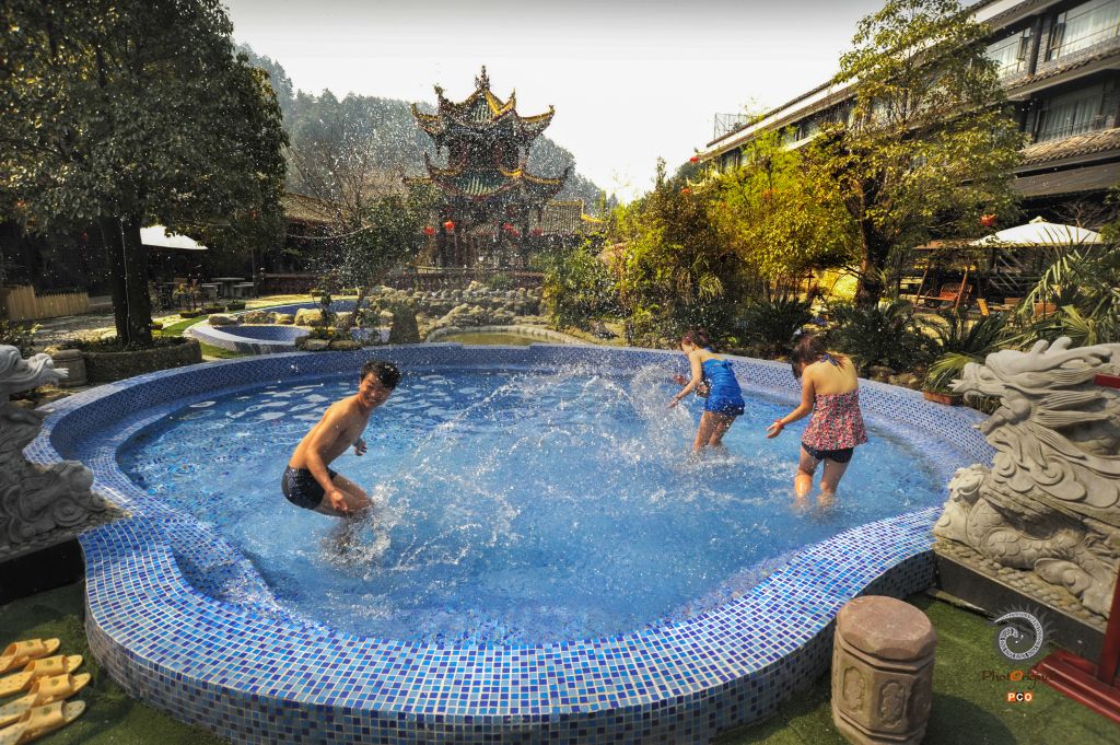 游客在贵州省开阳县双流镇白马洞热水村白马峪温泉池里嬉戏休闲娱乐。