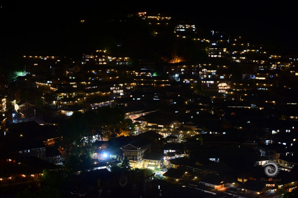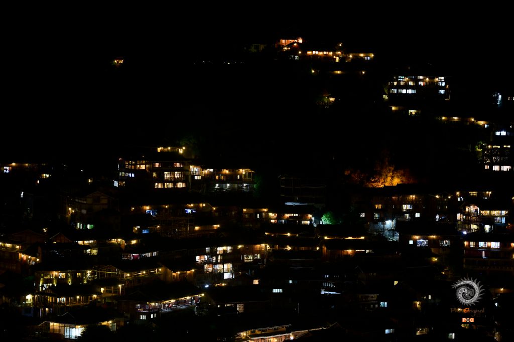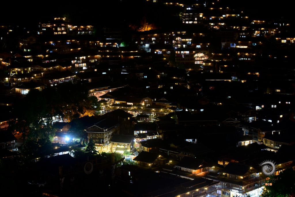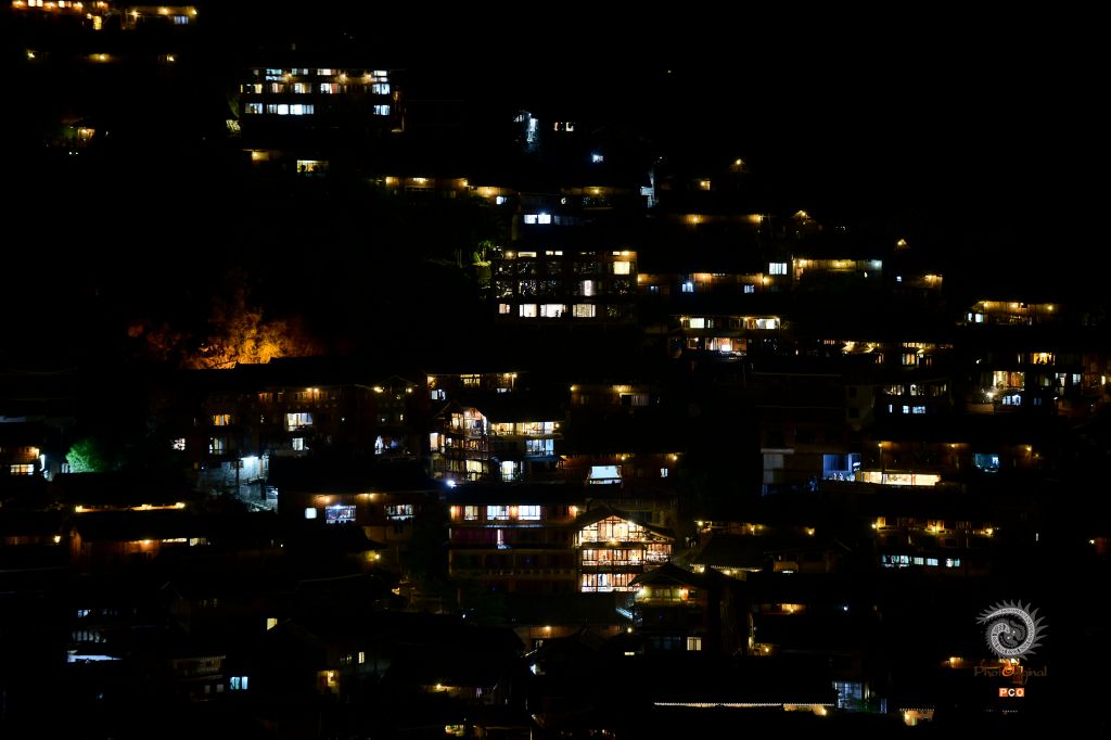 但夜色降临,寨子里的灯光亮起来,远处看去星星点点,像极了漫天星空
