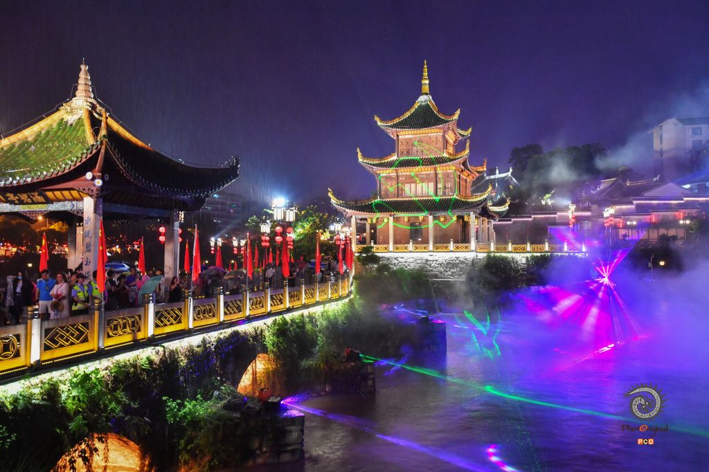 雨中,贵州省贵阳市甲秀楼进行激光灯光秀活动,庆祝建党百年。