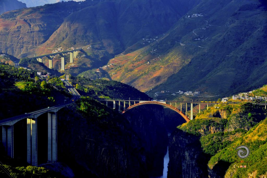 火车穿越北盘江峡谷大桥