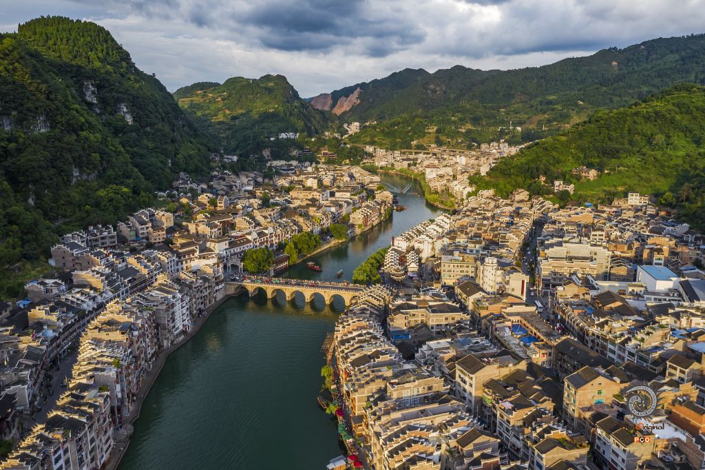 夕阳下的镇远古镇。2019.08.03拍摄于贵州镇远古镇(航拍)